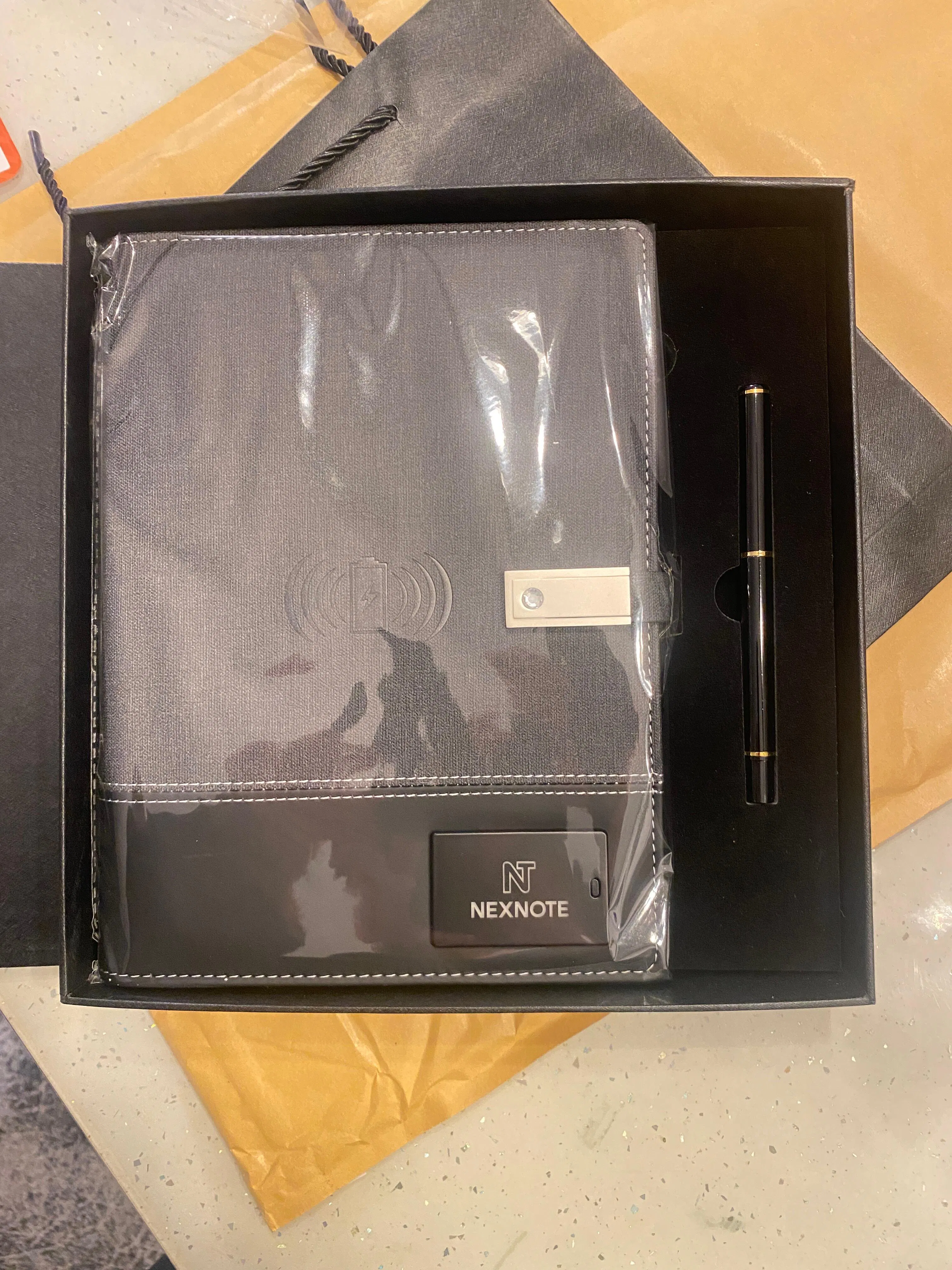 The NEXNOTE wireless charging notebook is a modern everyday accessory that combines wireless charging, 16GB storage, and a bright LED logo in a sleek, premium design. It brings technology and classic note-taking together to keep your workspace efficient and stylish.